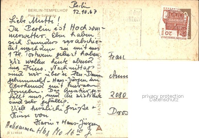 72583840 alte Postkarte BERLIN CITY Tempelhof Platz der Luftbruecke postalisch gelaufen Erhaltung siehe scans [LiesaD40] KatCode: 11110011000000