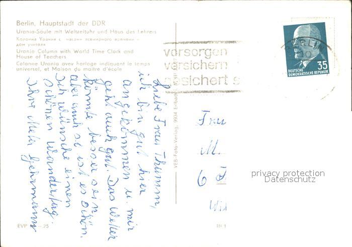 71942011 alte Postkarte BERLIN CITY Urania Saeule mit Weltzeituhr Haus des Lehrers Hauptstadt der DDR postalisch gelaufen Erhaltung siehe scans KatCode: 11110011000000