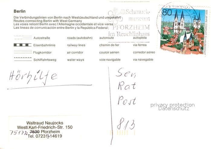 72958535 alte Postkarte BERLIN CITY Verbindungslinien nach Westdeutschland postalisch gelaufen Erhaltung siehe scans [PaolaD17] KatCode: 11110011000000