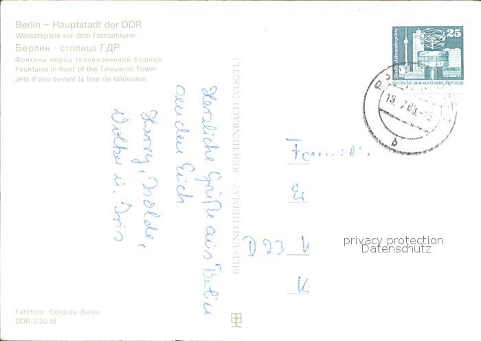 72052762 alte Postkarte BERLIN CITY Wasserspiele vor dem Fernsehturm Hauptstadt der DDR postalisch gelaufen Erhaltung siehe scans KatCode: 11110011000000