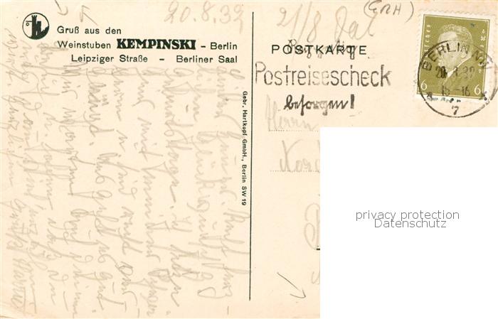 73810073 BERLIN CITY Weinstuben Kempinski Berliner Saal postalisch gelaufen Erhaltung siehe scans [FriedD77] alte Postkarte Frie Katcode 11110011000000