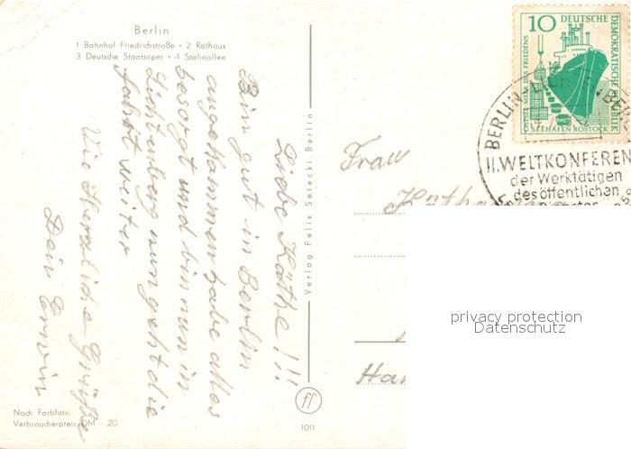 73242845 alte Postkarte BERLIN DE Bahnhof Friedrichstrasse Rathaus Deutsche Staatsoper Stalinallee postalisch gelaufen Erhaltung siehe scans [LiesaD40] KatCode: 11110011000000