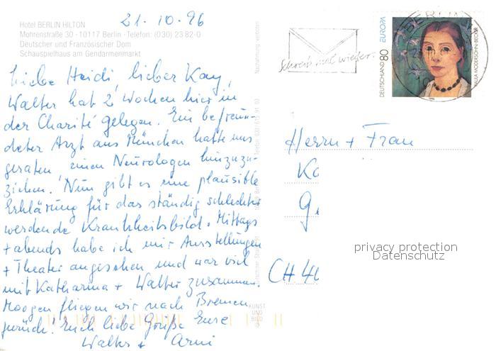 73164119 alte Postkarte BERLIN DE Berlin-Hilton Gendarmenmarkt Schauspielhaus Deutscher- und Franzoesicher Dom postalisch gelaufen Erhaltung siehe scans [LiesaD40] KatCode: 11110011000000