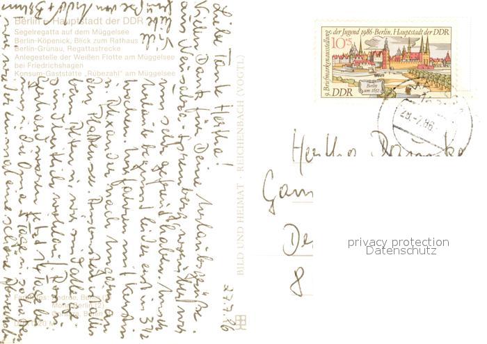 73155346 alte Postkarte BERLIN DE Segelregatta Mueggelsee Koepenick Rathaus Gruenau Regattastrecke Friedrichshagen Weisse Flotte Konsumgaststaette Ruebezahl postalisch gelaufen Erhaltung siehe scans [WerneD78] KatCode: 11110011000000