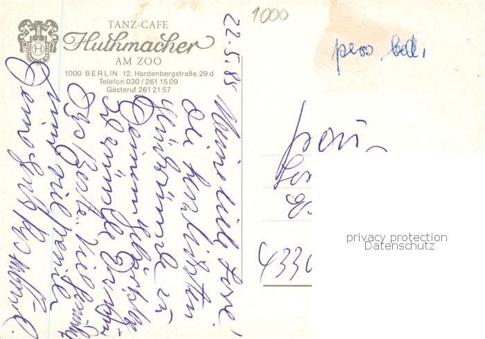 73870517 BERLIN DE Tanz Cafe Huthmacher am Zoo postalisch nicht gelaufen Erhaltung siehe scans [WerneD78] Wern Katcode 11110011000000