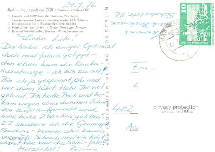 73306072 alte Postkarte Berlin Fernsehturm Brandenburger Tor Hotel Unter den Linden Bahnhof Friedrichstrasse postalisch gelaufen Erhaltung siehe scans [WerneD78] KatCode: 11110011000000