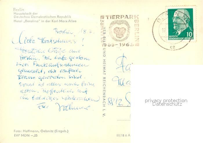 73335658 alte Postkarte Berlin Hotel Berolina Karl Marx Allee Hauptstadt der DDR postalisch gelaufen Erhaltung siehe scans [FriedD77] KatCode: 11110011000000