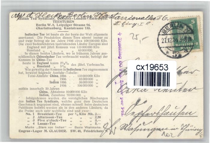 30726977 alte Postkarte Berlin Indische Tee Stube postalisch gelaufen KatCode: 11110011000000