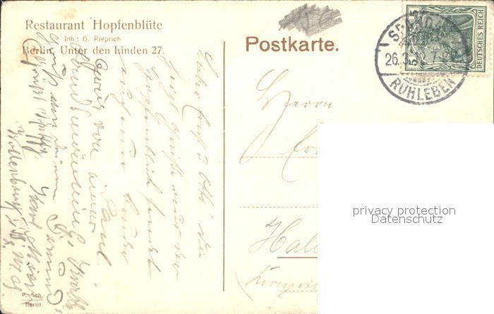 32030125 alte Postkarte Berlin Restaurant Hopfenbluete postalisch gelaufen Erhaltung siehe scans KatCode: 11110011000000