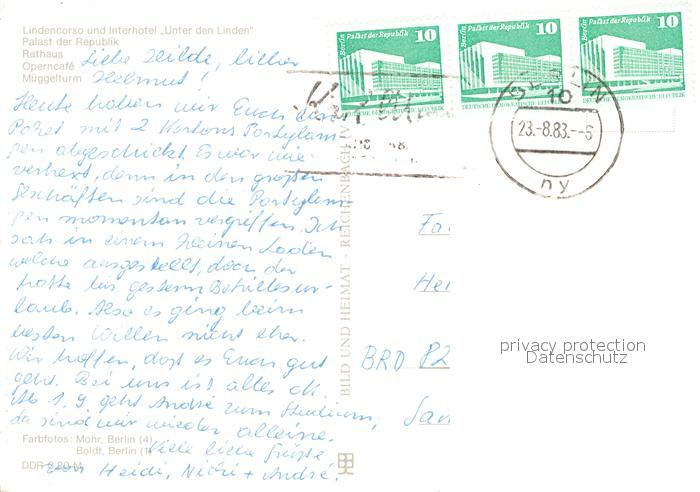 73306066 alte Postkarte Berlin Unter den Linden Palast der Republik Rathaus Operncafe Mueggelturm postalisch gelaufen Erhaltung siehe scans [WerneD78] KatCode: 11110011000000