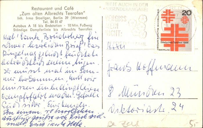 30726934 alte Postkarte Berlin Wannsee Restaurant Cafe zum alten Albrechts Teerofen postalisch gelaufen KatCode: 11110011000000