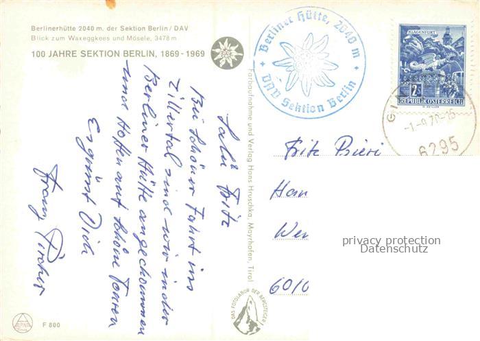 74157591 alte Postkarte Berlinerhuette Berliner-Huette 2040 Zillertal Tirol AT Berlinerhuette Waxeggkees Moesele Gletscher Bergpfad Zillertal DAV-Huette Berghuette postalisch gelaufen Erhaltung siehe scans [Karloger] KatCode: 11390335070920