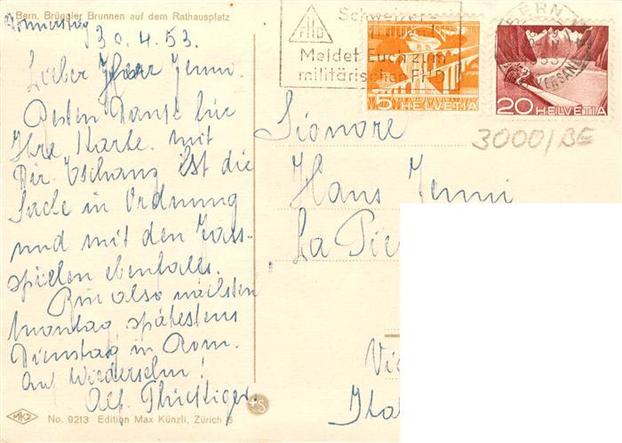 13895976 alte Postkarte Bern BE Brueggler Brunnen auf dem Rathausplatz Aquarell postalisch gelaufen Erhaltung siehe scans [WerneD78] KatCode: 11470060130948