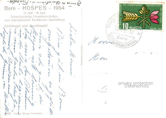 13867820 alte Postkarte Bern BE Hospes 1954 Schweizer Fremdenverkehrs und internat Kochkunst Ausstellung Lichtkugel und Leuchtnadel postalisch gelaufen Erhaltung siehe scans [WerneD78] KatCode: 11470060130948
