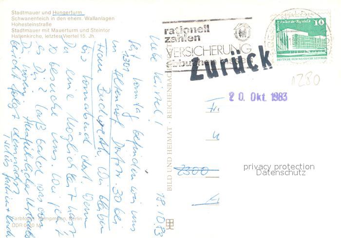 73650192 alte Postkarte Bernau Berlin Stadtmauer Hungerturm Schwanenteich Wallanlagen Hohesteinstrasse Mauerturm Steintor Hallenkirche 15. Jhdt. postalisch gelaufen Erhaltung siehe scans [FriedD77] KatCode: 11110012060020