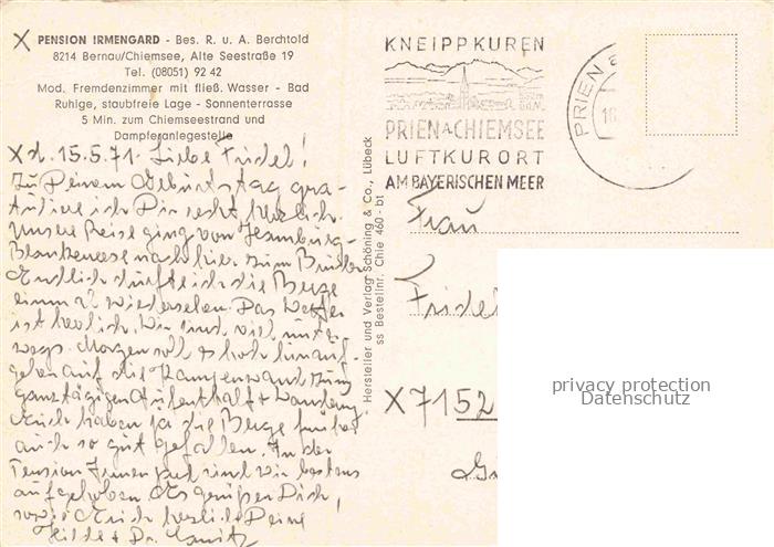 74132277 alte Postkarte Bernau Chiemsee Bayern Pension Irmengard Garten Panorama Blick ueber den See Alpen postalisch gelaufen Erhaltung siehe scans [FriedD77] KatCode: 11110009187118