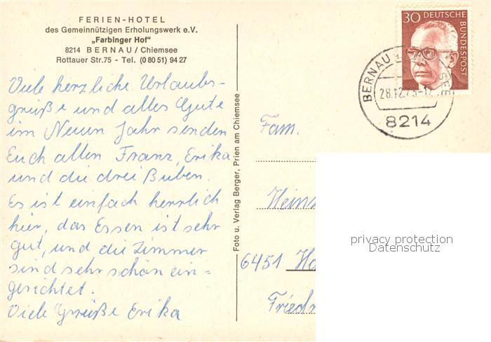 73765930 alte Postkarte Bernau Chiemsee Ferienhotel Farbinger Hof postalisch gelaufen Erhaltung siehe scans [FriedD77] KatCode: 11110009187118