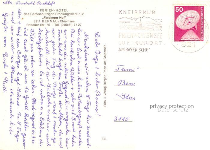 72929757 alte Postkarte Bernau Chiemsee Ferienhotel Farbinger Hof postalisch gelaufen Erhaltung siehe scans [KathaD81] KatCode: 11110009187118