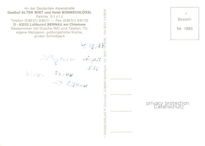 73662295 Bernau Chiemsee Gasthof Alter Wirt Hotel Bonnschloessl postalisch nicht gelaufen Erhaltung siehe scans [FriedD77] KatCode: 11110009187118