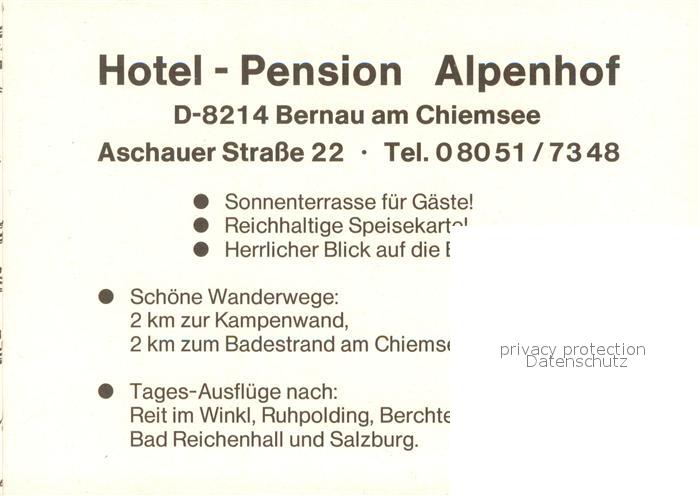 73731356 Bernau Chiemsee Hotel Pension Alpenhof Restaurant Bar postalisch nicht gelaufen Werbekarte (keine Postkarte) Erhaltung siehe scans [FriedD77] KatCode: 11110009187118