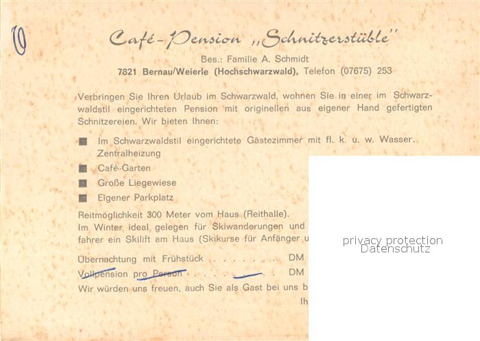 73338812 Bernau Schwarzwald Cafe Pension Schnitzerstueble postalisch nicht gelaufen Werbekarte (keine Postkarte) Erhaltung siehe scans [WerneD78] KatCode: 11110008337013