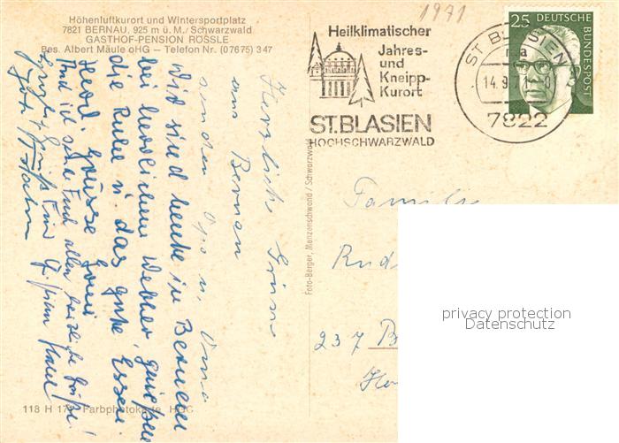 73785207 alte Postkarte Bernau Schwarzwald Gasthof Pension Roessle postalisch gelaufen Erhaltung siehe scans [WerneD78] KatCode: 11110008337013