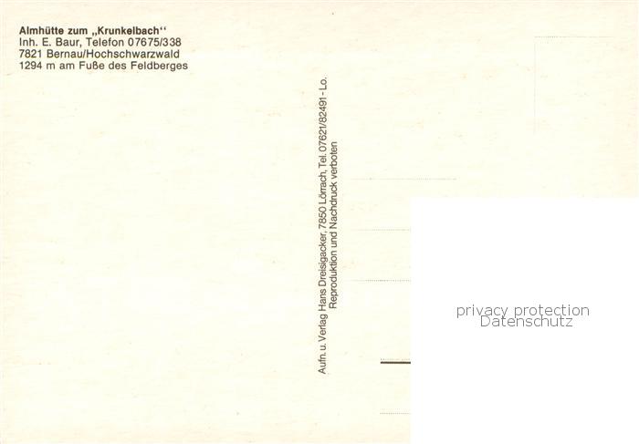 73755413 Bernau Schwarzwald Herzogenhorn Krunkelbach Huette Feldsee Belchen Bernau Menzenschwand postalisch nicht gelaufen Erhaltung siehe scans [FriedD77] KatCode: 11110008337013