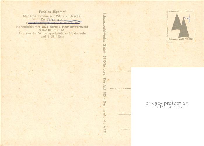73642177 Bernau Schwarzwald Pension Jaegerhof postalisch nicht gelaufen Erhaltung siehe scans [WerneD78] KatCode: 11110008337013
