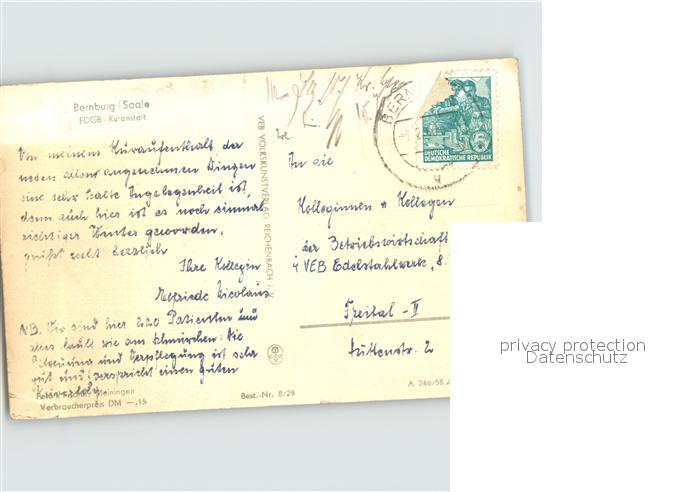 72412521 alte Postkarte Bernburg Saale FDGB Kuranstalt postalisch gelaufen Erhaltung siehe scans KatCode: 11110015089030