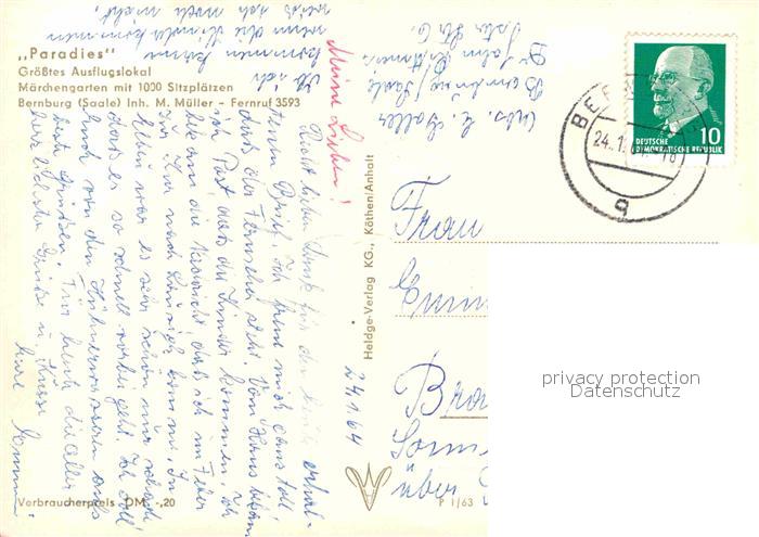 72648642 alte Postkarte Bernburg Saale Paradies Maerchengarten postalisch gelaufen Erhaltung siehe scans [NatalD47] KatCode: 11110015089030