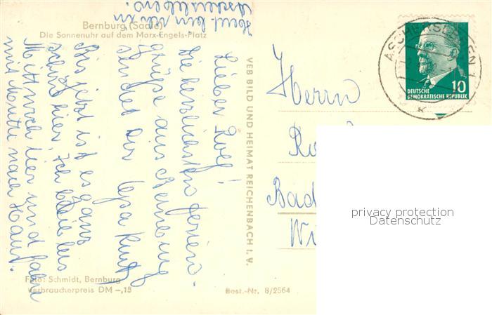 73770832 alte Postkarte Bernburg Saale Sonnenuhr a. d. Marx-Engels-Platz postalisch gelaufen Erhaltung siehe scans [LiesaD40] KatCode: 11110015089030