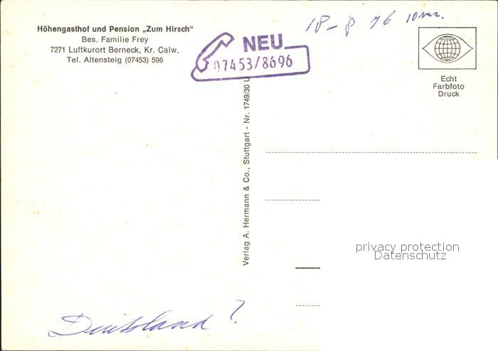 72225009 Berneck Altensteig Gasthaus Pension Zum Hirsch postalisch nicht gelaufen Erhaltung siehe scans KatCode: 11110008235006