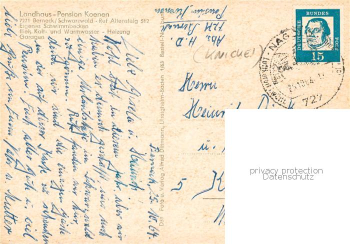73858799 alte Postkarte Berneck Altensteig Landhaus Pension Koenen im Schwarzwald postalisch gelaufen Erhaltung siehe scans [FriedD77] KatCode: 11110008235006