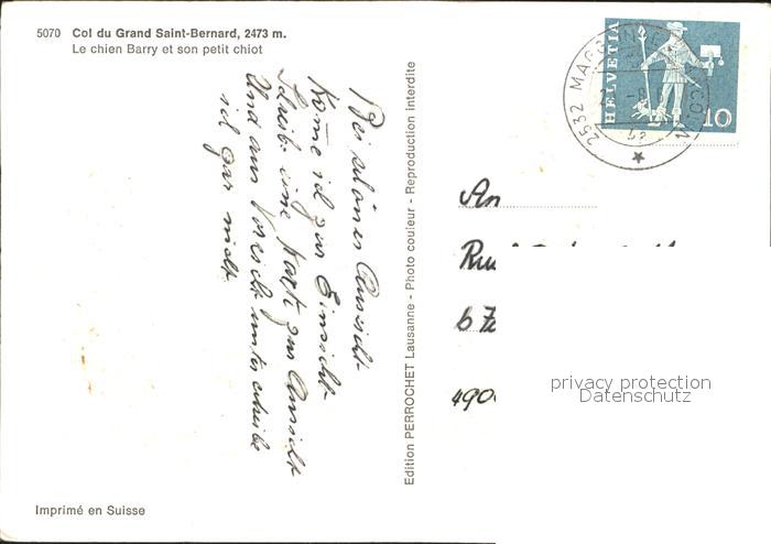 alte Postkarte Bernhardiner Chien Barry er son petit chiot Col du Grand Saint-Bernard postalisch gelaufen Erhaltung siehe scans