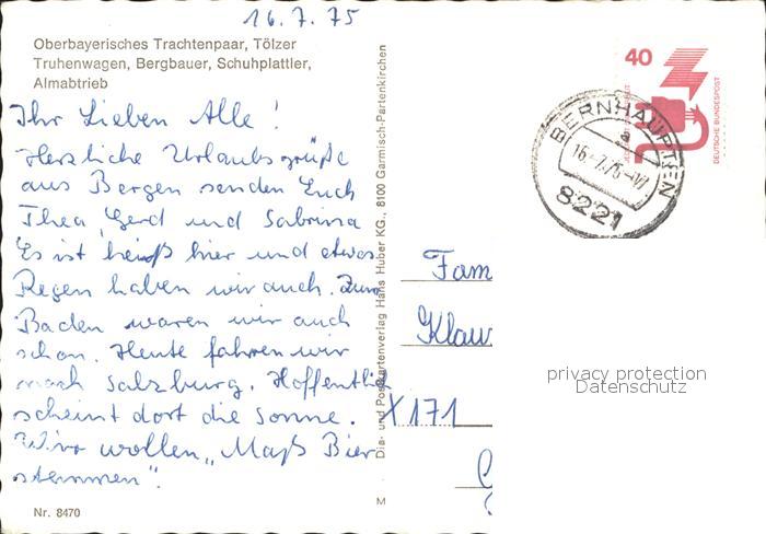 72325938 alte Postkarte Bernhaupten Trachtenpaar Toelzer Truhenwagen Bergbauer Schuhplattler Almabtrieb postalisch gelaufen Erhaltung siehe scans KatCode: 11110009189113