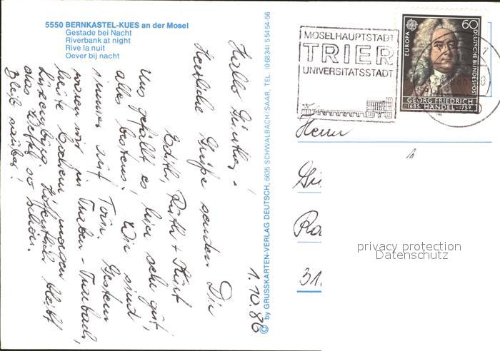 72291296 alte Postkarte BERNKASTEL-KUES Berncastel Rheinland-Pfalz Brueckenpartie bei Nacht postalisch gelaufen Erhaltung siehe scans KatCode: 11110007231008