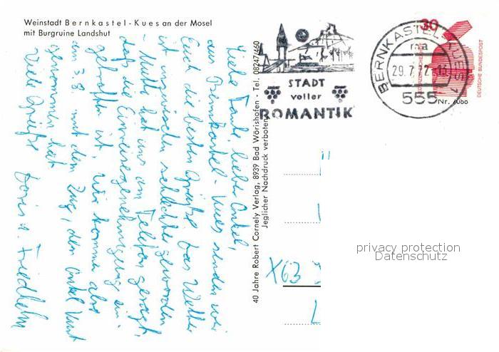 72629274 alte Postkarte BERNKASTEL-KUES Berncastel Rheinland-Pfalz Burgruine Landshut Fliegeraufnahme Kirche Fachwerkhaeuser Moselpartie postalisch gelaufen Erhaltung siehe scans [WerneD78] KatCode: 11110007231008
