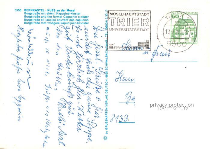 73780300 BERNKASTEL-KUES Berncastel Rheinland-Pfalz Burgstrasse mit ehemaligem Kapuzinerkloster postalisch gelaufen Erhaltung siehe scans [FriedD77] alte Postkarte Frie Katcode 11110007231008