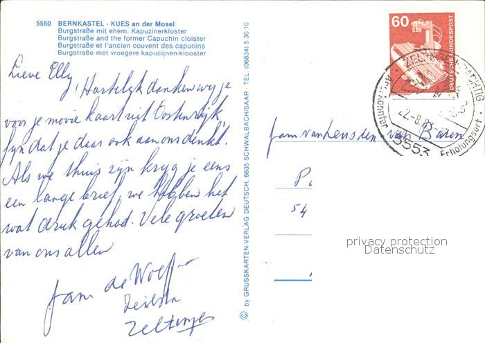 72272665 alte Postkarte BERNKASTEL-KUES Berncastel Rheinland-Pfalz Burgstrasse postalisch gelaufen Erhaltung siehe scans KatCode: 11110007231008