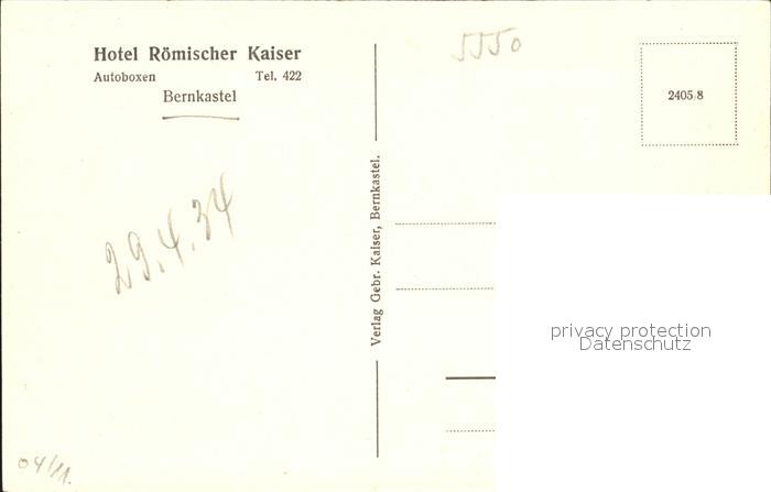 72094470 BERNKASTEL-KUES Berncastel Rheinland-Pfalz Hotel Roemischer Kaiser Blick ins Moseltal postalisch nicht gelaufen Erhaltung siehe scans KatCode: 11110007231008