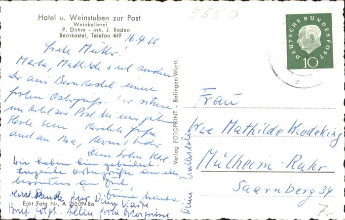 40920584 BERNKASTEL-KUES Berncastel Rheinland-Pfalz Hotel Weinstuben zur Post Weinkellerei postalisch gelaufen Alte Ansichtskarte Postkarte alte Postkarte Katcode 11110007231008