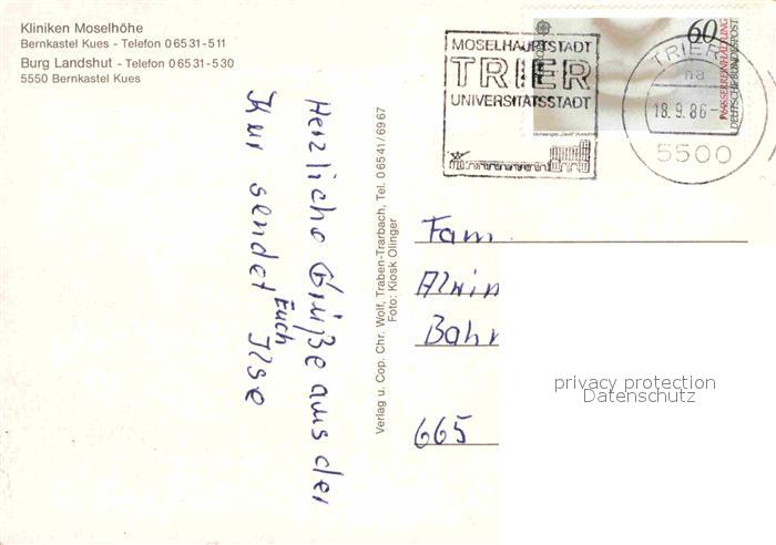 72755472 alte Postkarte BERNKASTEL-KUES Berncastel Rheinland-Pfalz Kliniken Moselhoehe Rehazentrum Burg Landshut postalisch gelaufen Erhaltung siehe scans [WerneD78] KatCode: 11110007231008