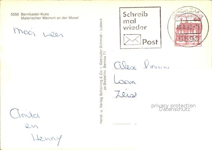 72255424 alte Postkarte BERNKASTEL-KUES Berncastel Rheinland-Pfalz mit Moselpartie postalisch gelaufen Erhaltung siehe scans KatCode: 11110007231008