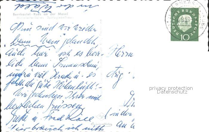 72095595 alte Postkarte BERNKASTEL-KUES Berncastel Rheinland-Pfalz Mittelalterliches Spitzgiebelhaus Fachwerkhaus Giebel postalisch gelaufen Erhaltung siehe scans KatCode: 11110007231008