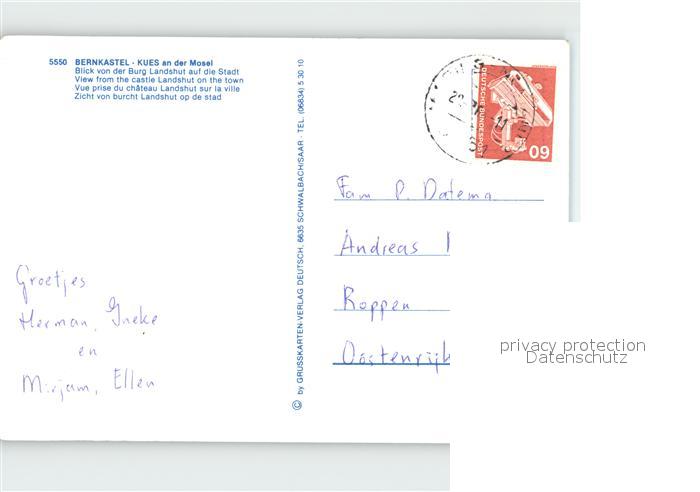 72256765 alte Postkarte BERNKASTEL-KUES Berncastel Rheinland-Pfalz Moselpartie Blick von der Burg Landshut postalisch gelaufen Erhaltung siehe scans KatCode: 11110007231008
