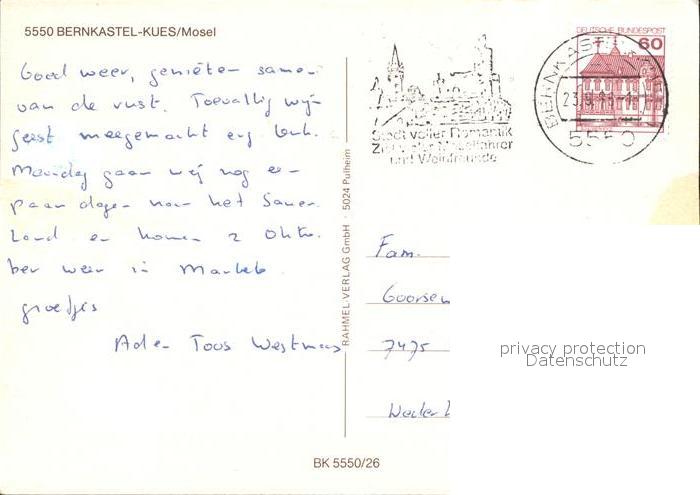 72303777 alte Postkarte BERNKASTEL-KUES Berncastel Rheinland-Pfalz Stadtansicht postalisch gelaufen Erhaltung siehe scans KatCode: 11110007231008