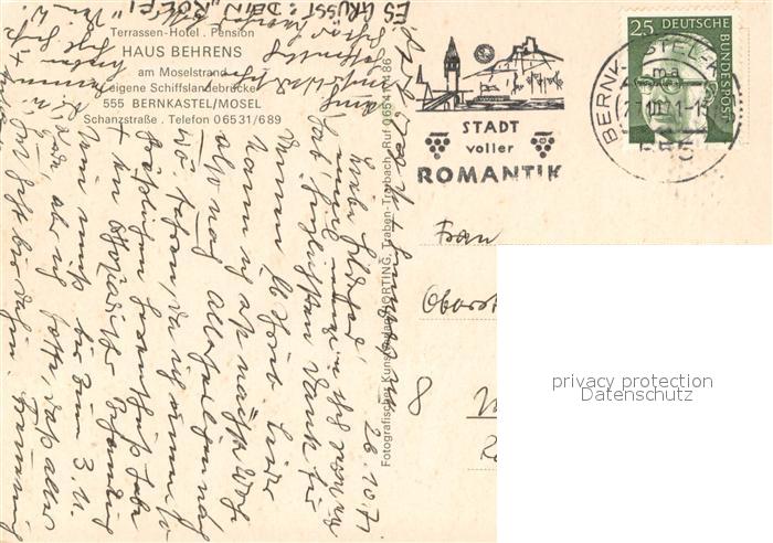 73741279 BERNKASTEL-KUES Berncastel Rheinland-Pfalz Terrassen Hotel Haus Behrens Moselpartie postalisch gelaufen Erhaltung siehe scans [FriedD77] alte Postkarte Frie Katcode 11110007231008