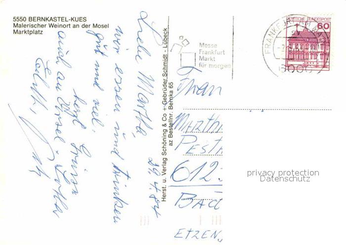 72825787 alte Postkarte BERNKASTEL-KUES Berncastel Rheinland-Pfalz Weinort an der Mosel Marktplatz Fachwerk postalisch gelaufen Erhaltung siehe scans [LiesaD40] KatCode: 11110007231008