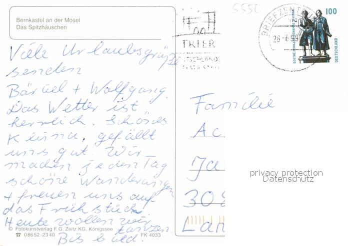 72901017 alte Postkarte Bernkastel-Kues Das Spitzhaeuschen postalisch gelaufen Erhaltung siehe scans [WerneD78] KatCode: 11110007231008