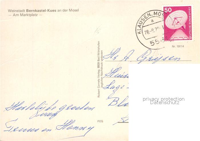 72942081 alte Postkarte Bernkastel-Kues Marktplatz Fachwerkhaeuser Cafe am Rathaus Altstadt postalisch gelaufen Erhaltung siehe scans [FriedD77] KatCode: 11110007231008